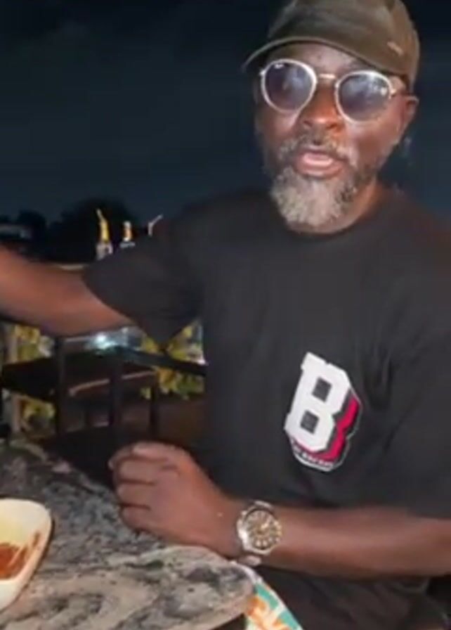 A man wearing a black t-shirt, a green Jeep cap, and sunglasses sits at a marble table