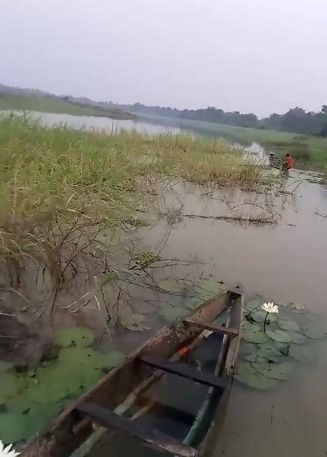 The video opens with a view of a narrow, still body of water, possibly a river or lake, on a misty day. The water is brown and murky. A small, old wooden boat is positioned in the foreground near a patch of lily pads with a single white lotus flower blooming. Lush green vegetation lines the banks of the waterway. In the distance, a person wearing a red shirt appears to be wading in the water near some tall reeds. The camera pans slightly to the right, offering a broader view of the waterway and the dense vegetation along its edges. The sky is overcast and pale.