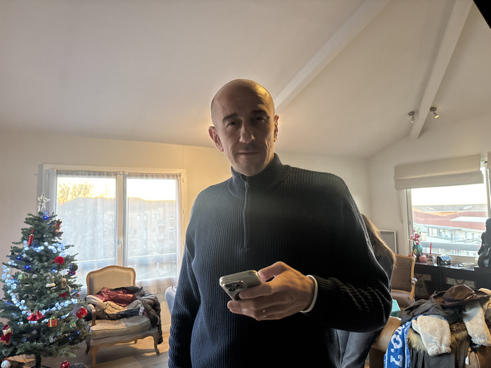 The scene is an interior view of a residential living space in Marseille, France, possibly an attic apartment given the sloped ceiling with exposed beams and spotlights. A bald, light-skinned male, wearing a dark blue ribbed quarter-zip sweater, stands centrally in the foreground, looking directly at the camera. He holds a silver smartphone horizontally in his left hand; a wedding band is visible on his left ring finger. To the man's left, a decorated Christmas tree with blue-white lights, red, and white ornaments stands beside a large window. Through this window, a bright outdoor scene with bare tree branches and distant residential buildings is visible. An antique-style armchair, upholstered in a patterned fabric and covered with a maroon jacket and grey garment, is positioned between the Christmas tree and the window. To the man's right, the back and shoulder of another individual are partially visible behind him. Further to the right, a dark console table holds various objects, including a vase with flowers and a dark figurine. Beneath this table, a stack of clothing items includes a blue and white scarf emblazoned with "O.M.," identifying the Olympique de Marseille football club and confirming the city location. The window to the right of the console table overlooks urban rooftops, some with red tiles, and additional buildings.