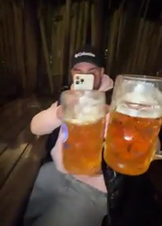 two people sitting at a wooden picnic table outside at night. One person is holding a large glass beer mug, and the other person uses their phone to record a video of both mugs clinking together. A third beer mug is also visible on the table. The person recording the video is wearing a black cap and a pink sweatshirt under a black vest. A wooden fence is visible in the background.