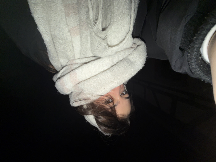 A person is seen from an upside-down perspective, partially obscured by a chunky, off-white scarf wrapped around their head. Only their eyes and some of their hair are visible below the scarf. They are wearing a dark-colored sweater or jacket. The background appears to be dark or nighttime. The lighting is dim, casting shadows on their face and scarf.