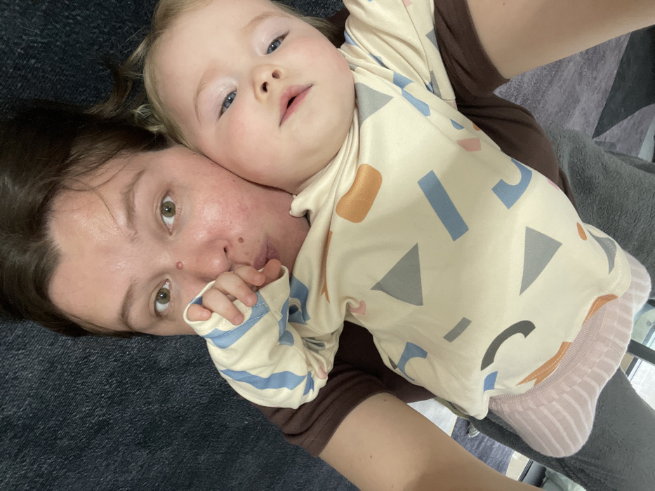 A woman and a baby are lying down. The woman has brown hair and green eyes. The baby has blonde hair and blue eyes, wearing a patterned pajama top with blue, gray, and peach geometric shapes. The woman is wearing a brown top. The background includes a dark gray couch and light gray clothing. The camera is oriented at an angle, providing a close-up view of the pair.