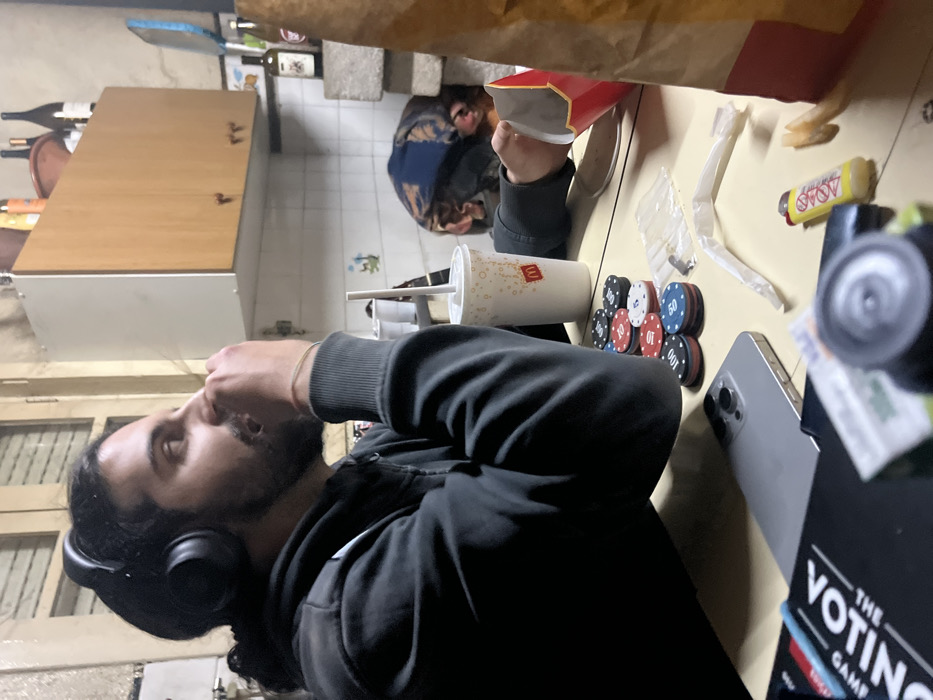 A man in headphones and a dark hoodie sits at a table. On the table is a McDonald’s cup, a fry box, poker chips, a silver iPhone, and a board game called "The Voting Game." A yellow tube and a plastic utensil wrapper are also visible. In the background are kitchen cabinets, bottles, and a person wrapped in a blanket on the floor. The lighting in the room is dim.