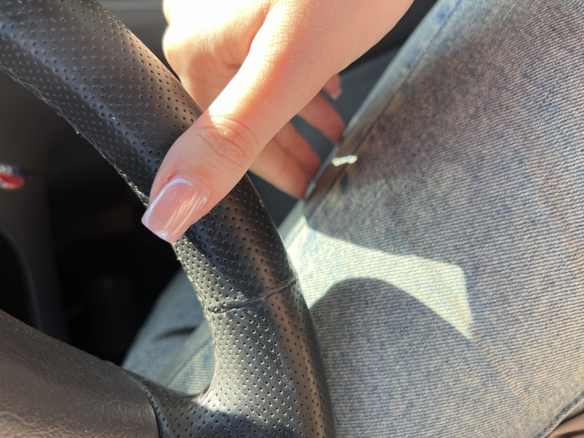 A close-up shows a hand with a light pink manicure holding a black, perforated leather steering wheel