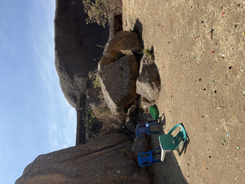 This image displays an arid, rocky outdoor environment in Wang, Nigeria, under a clear blue sky with minimal cloud cover. The foreground and midground consist of light-brown, dry earth with scattered debris including red and other colored plastic bottle caps, small pieces of glass, and dried plant matter. Three plastic chairs are present: two blue chairs are upright, and one teal and white chair is tipped forward on its front legs. A green plastic crate, possibly for bottles, rests on the ground near a large boulder. Massive, dark-grey natural rock formations dominate the background and left side of the frame. A dark-grey concrete wall or structure is visible built into the rock formations in the background. Sparse, dry vegetation grows between the rocks and around the concrete structure. No individuals are present in the scene.