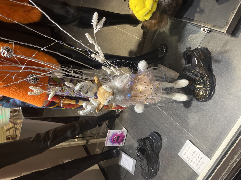 A store display showcases a mannequin in black attire, accented with orange and yellow fur pieces. A plush reindeer ornament with a pink dress and twinkling lights is placed near a pair of black sneakers. Another pair of sneakers and a promotional card are positioned nearby. A sign with store information is visible in the lower right corner. The display is shot from a slightly elevated angle, giving a clear view of the items.