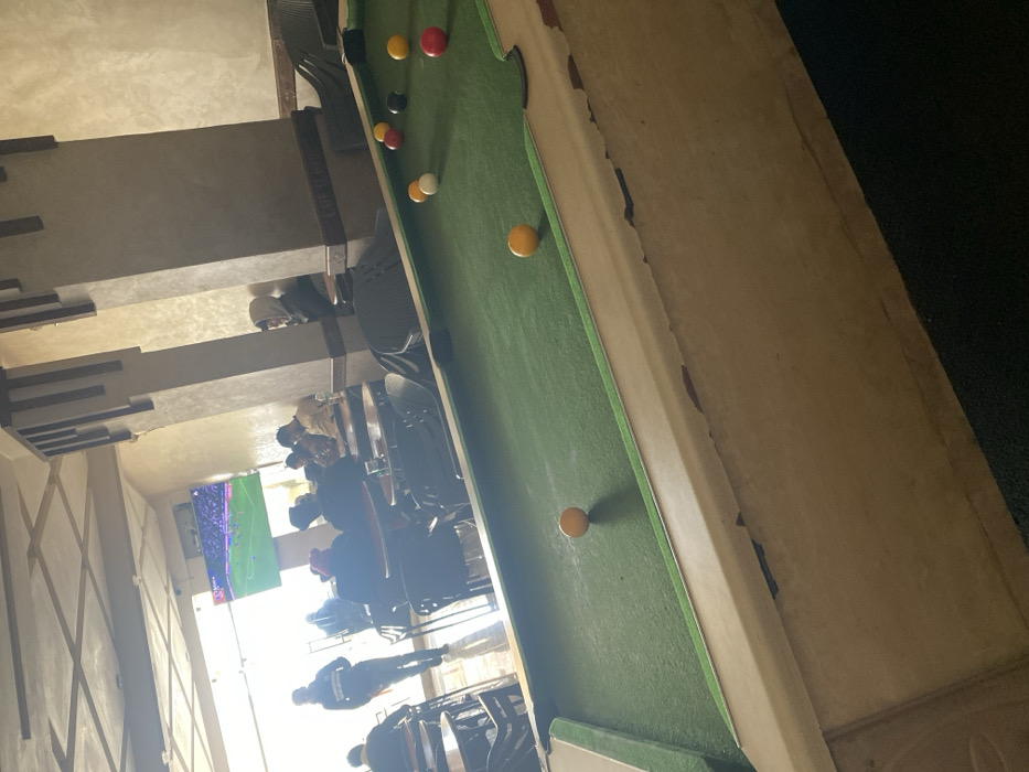 billiards table with several balls. The background features a lounge area with people sitting at tables, watching a TV. A figure stands in the hallway. The lighting appears to be coming from the windows, casting shadows. The view is from the side.