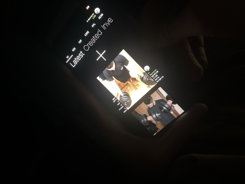 A person's hands are shown holding a smartphone in a dark, low-light environment. The smartphone screen is illuminated, displaying an application interface with a dark background and white text. The main header reads "Latest Created Inve," positioned above a large white plus sign. Smaller text elements like "HY," "NEU," "TOP," "CORE," "PPL," "LIVE," and "NEAR" are visible at the top of the screen, along with "e-georgiev." Two square images are presented within the application. The upper image shows a male individual, seen from a high angle, wearing a black hoodie, standing on a light wooden floor with a dumbbell visible nearby. The lower image shows the same male from a closer perspective, wearing a black t-shirt and holding a dumbbell in each hand. Text associated with these images includes "e-Georgiev," "09/09/20," "11:30," and the explicit location "Sofia, Bulgaria." Other fragmented text elements such as "attention," "8800," "watt," and "elite" are partially visible on the screen.