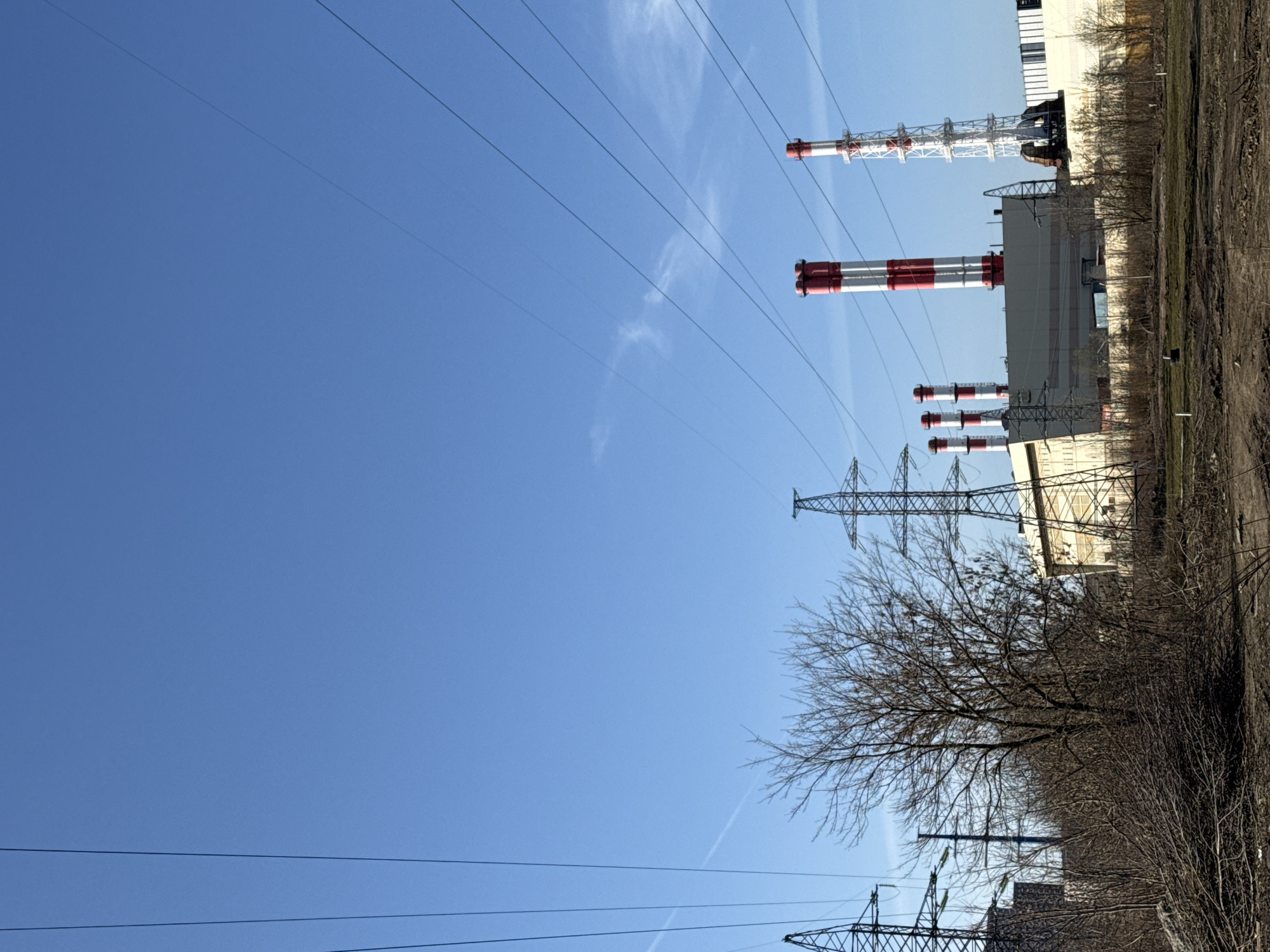 n industrial landscape in Moscow, Russia. There is a large power plant with multiple red and white striped smokestacks, set against a clear blue sky. High-voltage power lines run across the frame, supported by metal pylons. In the foreground, there are bare trees and shrubs, suggesting it is either late autumn or early spring. The background consists of industrial buildings and some vegetation.