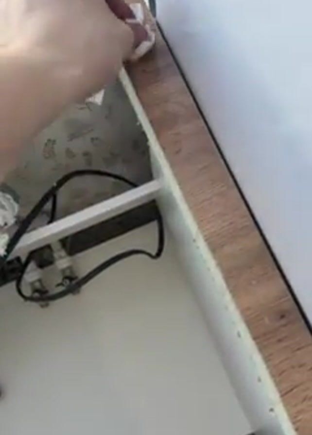 A hand holding a white tissue is wiping a wooden kitchen counter. The counter is brown with a wood grain pattern. The inside of the counter is white. Black wires and pipes are visible inside the cabinet. The base of the cabinet is white. The counter is next to a white wall. The tissue is held in the right hand of a person wearing Crocs. The person is cleaning the edge of the counter. Wallpaper with a floral design is inside the cabinet.