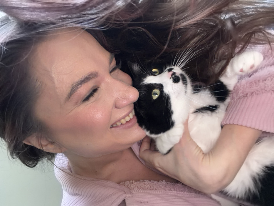 - "An indoor, high-angle close-up photograph features an adult female embracing a black and white tuxedo cat" by FM-Dx6k82, licensed under CC BY 4.0