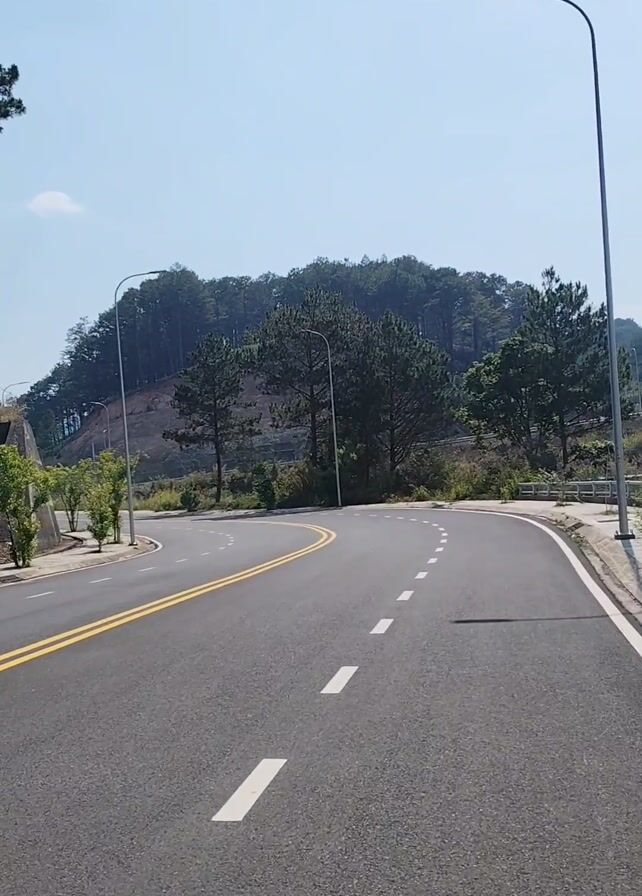 The camera rolls forward on a curvy road. On the left are some concrete structures, followed by trees and lampposts. The road is paved with gray asphalt, marked by double yellow lines on the left and dashed white lines on the right. Beyond the roadside, a hill covered in trees is visible under a clear blue sky.