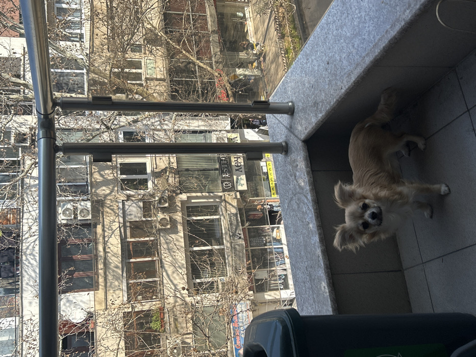 The scene depicts an elevated view from a balcony in Plovdiv, Bulgaria, overlooking an urban street with mixed-use buildings. In the foreground on the tiled balcony, a light tan, long-haired Chihuahua-type dog stands facing the camera. To the dog's left, a dark green, lidded waste bin is partially visible. The balcony features a grey granite-patterned parapet and a stainless steel and glass railing system. Below, across the street, are multi-story buildings with numerous windows and external air conditioning units. Ground-level retail shops are visible, displaying Cyrillic signage, including "ESTHE" on a black sign. Bare deciduous trees are interspersed throughout the urban landscape, casting shadows indicative of direct sunlight. Several individuals are present on the sidewalk below.