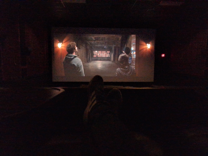In a darkened movie theater, a person's legs and feet, clad in striped sneakers, are visible in the foreground. A large screen displays a scene of two figures in a corridor. The figure on the left, with curly hair, wears a gray hoodie. The figure on the right also wears a gray hoodie. The corridor is brick and leads into the distance where lights shine. Two sconce lights are mounted on either side of the screen. An exit sign glows red in the upper right.