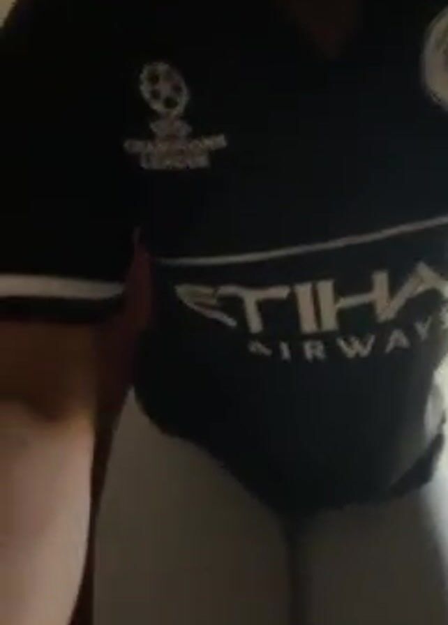 A person wearing a black Manchester City football shirt, gray leggings, and a hair bonnet adjusts their leggings. The person is standing indoors in front of a door and a wall with writing on it. The person faces the camera, then turns to their side.