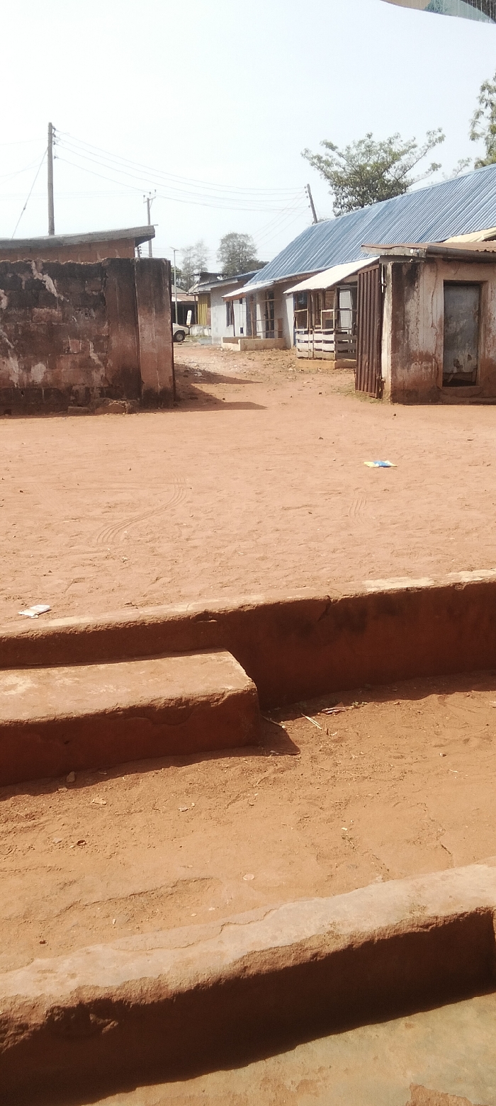 The image captures an outdoor, unpaved urban or semi-urban scene in the city of Unknown, Unknown, under bright daylight. The foreground features two low, worn, reddish-brown earth or concrete steps extending horizontally across the lower left. The ground consists predominantly of reddish-brown dirt, with faint tracks visible in the mid-left and minor debris scattered, including a small blue and yellow object on the dirt in the mid-right. To the left, a tall, weathered wall constructed of reddish-brown blocks or concrete rises. The background reveals a row of single-story structures, mostly appearing as shops or residences, lining an unpaved path. These buildings display varying finishes, some with light-colored facades, others with weathered, darker masonry, and several featuring open-fronted stalls with wooden slat structures. A building on the far right has a prominent blue corrugated metal roof and a dark, open doorway. Utility poles with multiple power lines are visible in the upper left and upper right, stretching across the sky. Green foliage from trees is discernible behind and above some of the structures. A white vehicle is partially visible behind the wall on the left. No individuals are present in the scene.