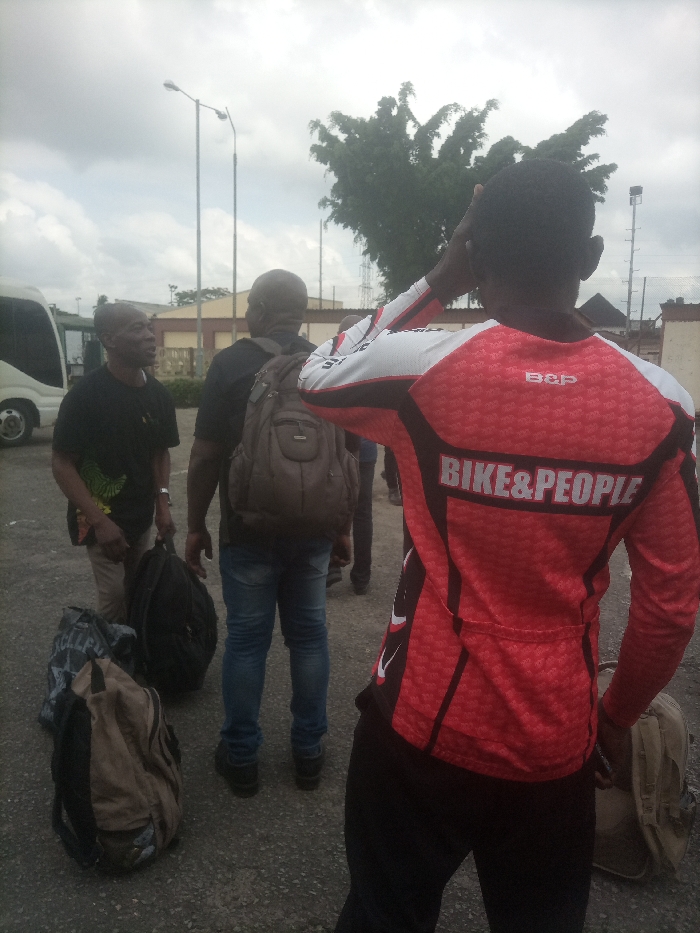 Several people stand outdoors, likely at a transit point. One wears a red and white cycling jersey with "BIKE&PEOPLE" printed on the back. A couple of people wear backpacks. A man on the left holds a black bag. A small white bus is visible. Overhead lighting is present. A cloudy sky suggests overcast weather. A tall tree is in the background, obscuring the tops of electric poles.