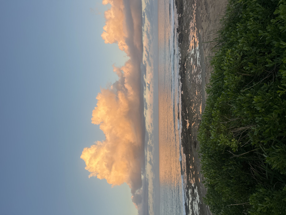 The image depicts a coastal scene at twilight, likely sunrise or sunset, within the Wollongong City Council area, Australia. The upper half of the frame is dominated by a clear, pale blue sky, transitioning to a lighter blue closer to the horizon. Horizontally across the mid-ground, a band of cumulus clouds, illuminated with a prominent warm orange-pink hue from the low sun, stretches across the sky, with larger formations to the left and right. Below the clouds, the ocean surface reflects this warm light, creating a shimmering orange-pink path across the water. Small waves are visible breaking closer to the shore. The immediate foreground features a rocky intertidal zone, partially submerged in calm water, with numerous tide pools reflecting the sky and cloud colors. The very bottom of the frame is occupied by dense, dark green leafy vegetation, extending across the width of the image, obscuring the ground directly beneath it. No people or artificial structures are present.