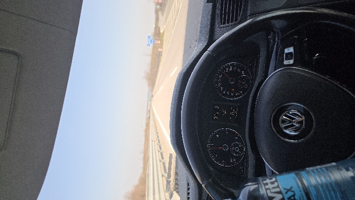 The scene depicts a first-person view from within a moving vehicle on a multi-lane highway in Kaloyanovets, Bulgaria, under a clear, bright sky. A partially visible blue and black bottle, labeled "Witt MAX," rests in the lower-left foreground. The black steering wheel with a silver Volkswagen emblem is centrally positioned. Behind the steering wheel, the illuminated instrument cluster displays a speedometer indicating approximately 90-100 units, a tachometer, and digital readouts. The dashboard features a textured surface, and a gray sun visor is visible at the top of the frame. The highway extends straight into the distance, bordered by metal guardrails on both sides. On the right side of the road, a blue circular sign with a white arrow pointing right and a red and white sign are observable. Distant trees and sparse vegetation line the highway shoulders.