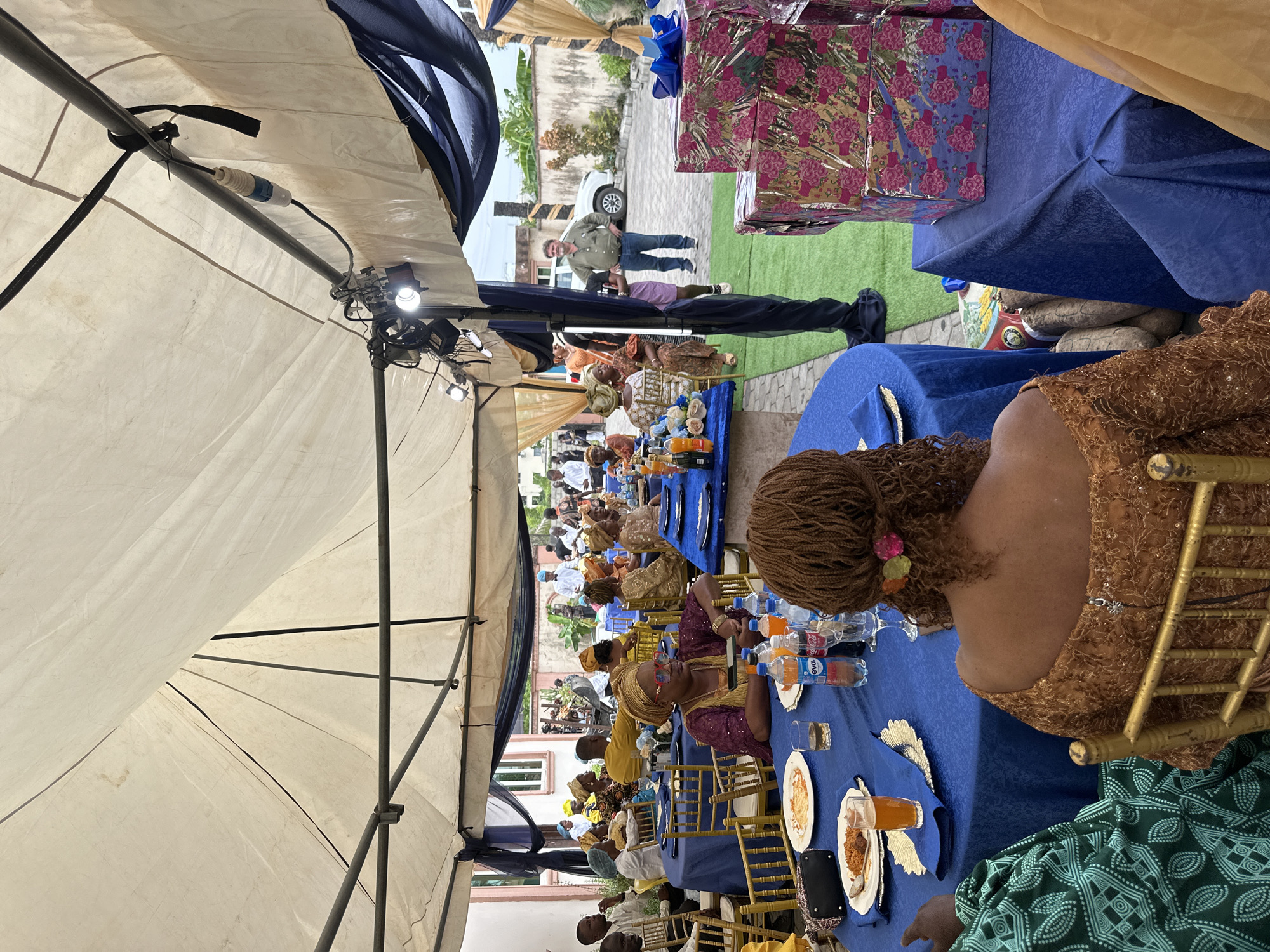 An outdoor event is depicted under a large white canvas tent with a metal frame and draped dark blue fabric, likely in Lagos, Nigeria. Numerous individuals, predominantly of African descent, are seated at round tables covered with blue tablecloths. Many women wear traditional Nigerian attire, including brightly colored headwraps (gele) and patterned garments. Men are dressed in both traditional and casual wear. Service staff in white shirts and dark ties are visible in the background. Plates of food, glasses of beverages (including juice and what appears to be alcohol), and bottles of water (Eva brand) and soft drinks (Coca-Cola, Fanta, Sprite) are present on the tables. In the foreground, a woman with braided hair, wearing a brown patterned dress, is seated with her back to the viewer. To her left, another person in a green patterned garment is partially visible. A stack of wrapped gifts, featuring pink floral and blue geometric patterns, is displayed on a small blue-covered table to the right. Yams or similar tubers are on the ground near this table. Outside the tent, on artificial green turf, a Caucasian male in a green long-sleeved shirt and blue jeans stands with hands on hips, observing the event. A white SUV is parked behind him. In the background, a white building with dark window frames is visible, along with a perimeter wall and vegetation. Lighting fixtures and electrical wiring are attached to the tent's metal framework overhead.