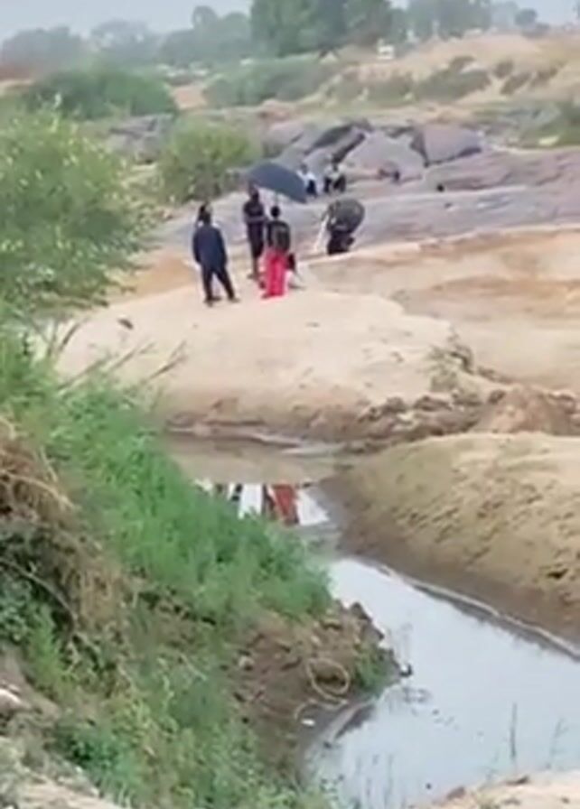 wide shot of a shallow stream running through a sandy area, with green vegetation on the banks. In the background, there is a group of people gathered on a rocky, sandy patch. Some people are holding umbrellas, possibly indicating rain. One person is wearing bright red clothing. The overall environment suggests an outdoor, natural setting, likely a riverbed or similar area, with an overcast sky.