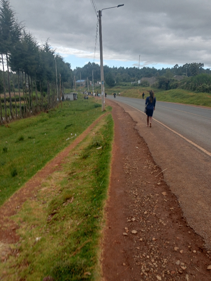 The image depicts an outdoor scene in Shamenei, Kenya, under an overcast sky. A paved road occupies the right side of the frame, bordered by a reddish-brown dirt and gravel shoulder. A woman, dressed in a dark blue long-sleeved dress, walks away from the camera on this shoulder, moving into the distance. To the left of the road, a dirt path runs parallel, followed by a strip of green grass and another dirt track on the far left. A utility pole supporting a streetlight is positioned left of the paved road. In the middle-distance, on the left side, approximately 10-15 individuals are congregated near small structures, and several motorcycles are also visible on or near the road. A line of tall, slender evergreen trees borders the far left of the scene. The background features densely forested hills, with a cellular transmission tower discernible on a distant ridge.