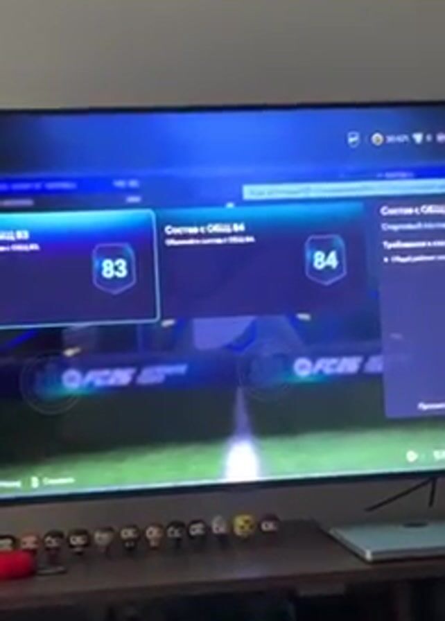 A person plays the FIFA video game on a large TV screen. The game interface is visible, displaying squad options and team ratings. A blue Playstation controller sits on the bed nearby. The TV sits atop a shelf containing an array of Funko Pop figurines. The camera then pans down to show the controller and then up again.