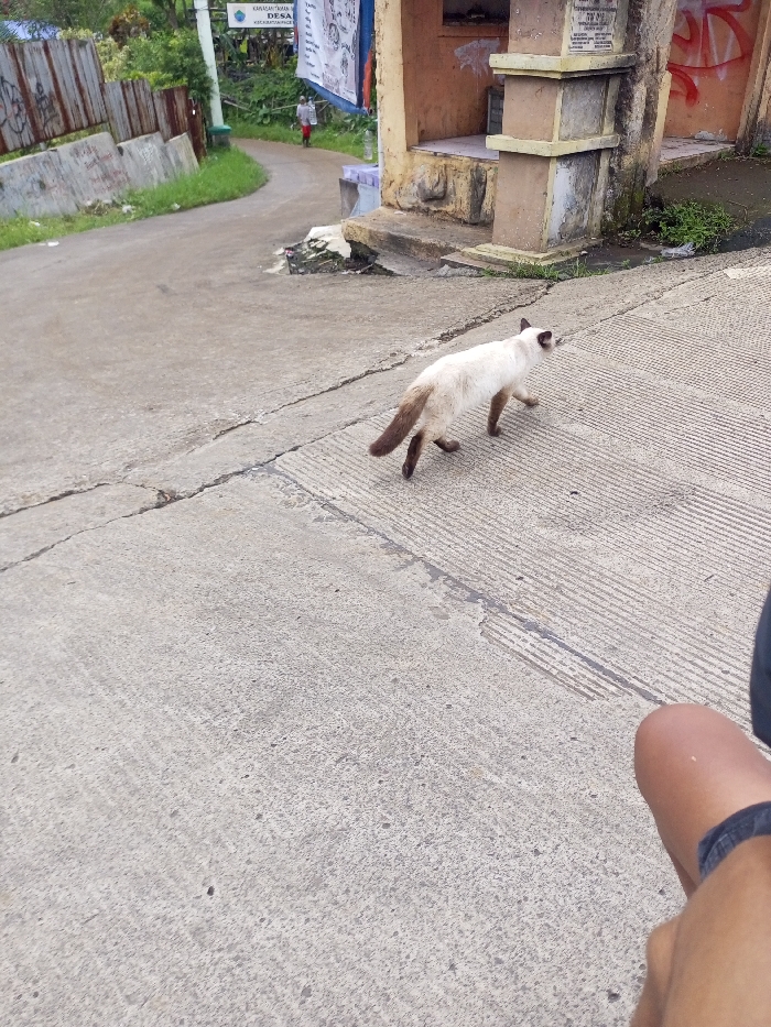 - "The image depicts an outdoor scene in Meyong, India, dominated by a cream-colored cat with dark brown points on its face, ears, paws, and tail, walking leftward across a rough concrete surface" by FM-0RTq02, licensed under CC BY 4.0