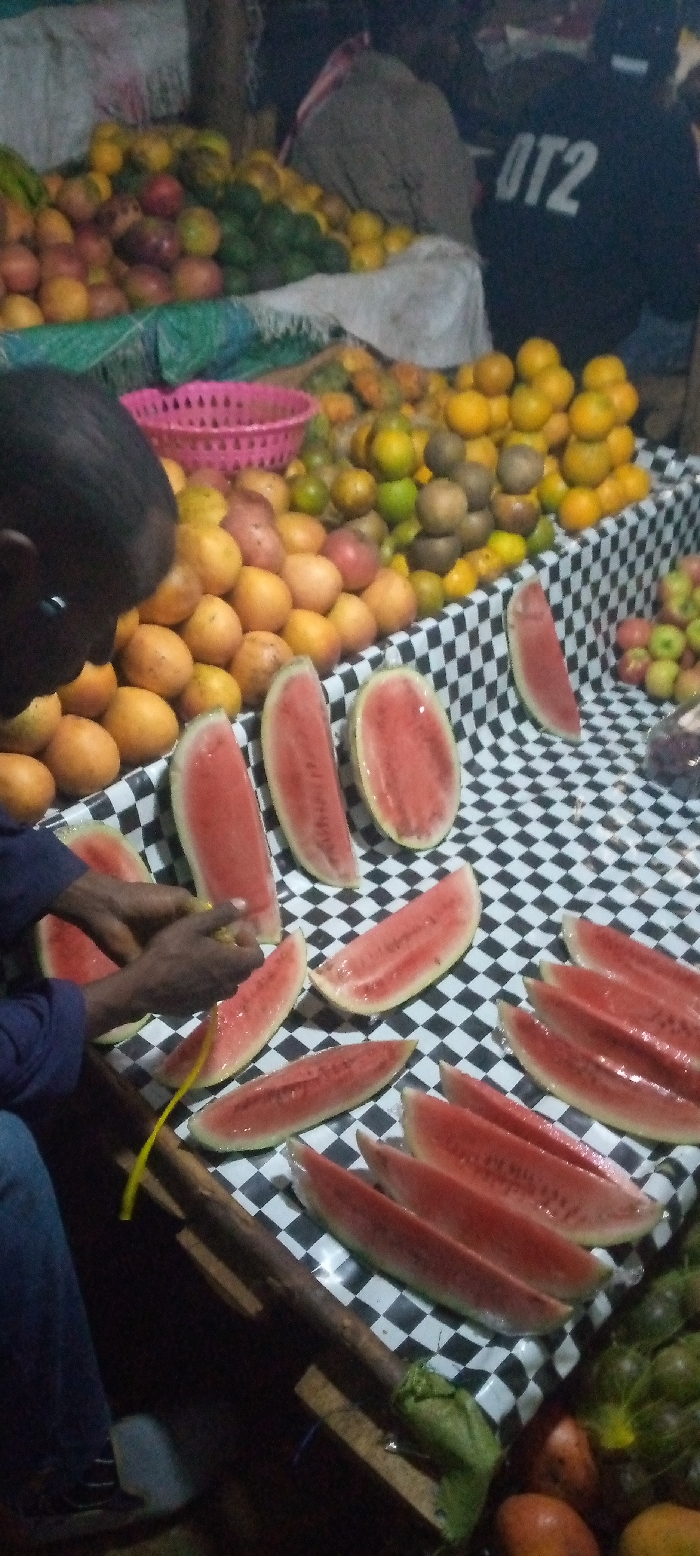 A fruit vendor stands at a market stall, slicing a watermelon into smaller wedges. The display features a checkered tablecloth with various fruits, including oranges, kiwi, apples, and mangoes. A person wearing a dark shirt with "OT2" printed on the back is visible. The scene is lit dimly, focusing on the fresh produce. A pink basket sits among the fruit.
