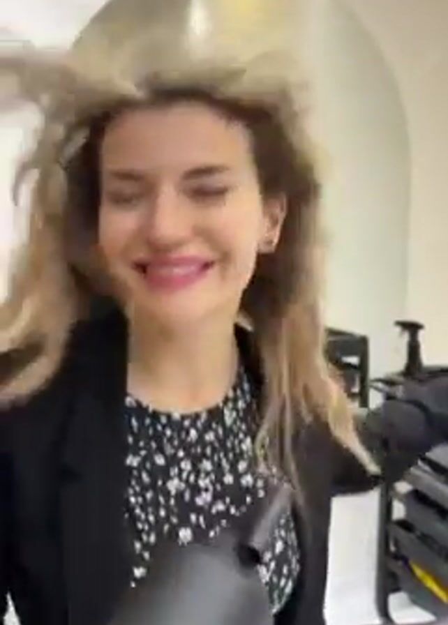In a brightly lit salon, a woman with blonde hair, wearing a black and white floral dress under a black blazer, is seen holding a black hair dryer. She is facing the camera, which is likely hand-held, and playfully swirling her hair around as the dryer blows air. A round mirror is visible behind her, reflecting the salon environment. In the background, a rack of styling tools and products is partially visible. The woman is smiling slightly, enjoying the effect of the air on her hair.