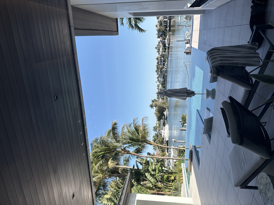 This image depicts a luxurious outdoor waterfront property in Naples, United States of America, under a clear blue sky