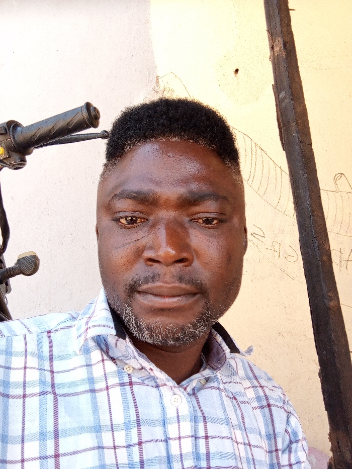 A forensic examination of the scene in Sabon Tasha, Nigeria, reveals an adult male individual centered in a portrait-style photograph. The subject, of apparent Black ethnicity, has short, dark, curly hair with some graying, and a short, salt-and-pepper beard. Two distinct, parallel linear scars are present on his left cheek. He wears a collared, button-down shirt featuring a plaid pattern of white, light blue, and maroon squares. His expression is neutral as he looks directly into the camera. The background consists of a cream-colored, textured wall. To the upper left, a black motorcycle or bicycle handlebar grip, a yellow button, and a lever are partially visible. To the right, a dark, weathered vertical wooden or metal post or beam is present, alongside faint, irregular pencil or charcoal markings on the wall surface. The scene is illuminated by ambient natural light.