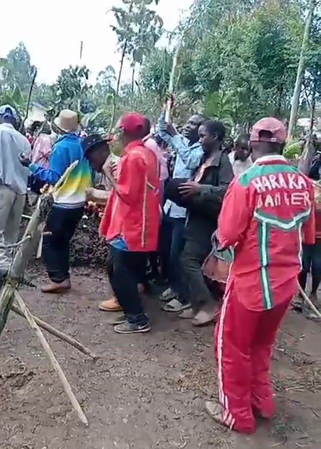 A crowd of people is gathered in an outdoor area, possibly a rural setting, as indicated by the trees and muddy ground. The people appear to be engaged in a lively event, as several individuals are seen dancing. Some are carrying items such as branches and what appears to be a tire. The attire of the individuals varies, with some wearing casual clothes and others in more formal outfits. One person stands out, wearing a red tracksuit with the words "HARAKA DANGER" on the back. The overall atmosphere seems festive and energetic.