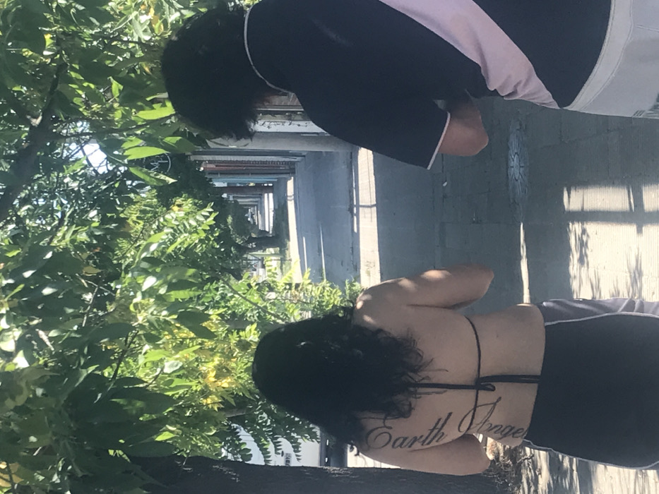 Two people stand on a sunny street with trees. The person at the bottom has a tattoo on their back that says "Earth Angel". The person at the top has dark hair and is wearing a black shirt with a white and pink stripe. The street is lined with buildings and there are shadows from the trees.