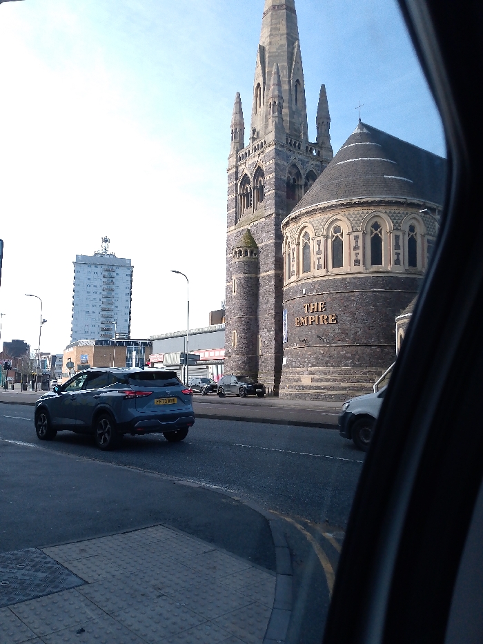 A blue Nissan Qashqai drives on a street in front of a church building. The church has a tall spire and rounded dome structure with “THE EMPIRE” inscribed. A white van is partially visible on the right, and other cars are parked along the street. A tall building rises in the distance to the left. The photograph is taken from inside a vehicle, with a part of the car's frame visible on the right.