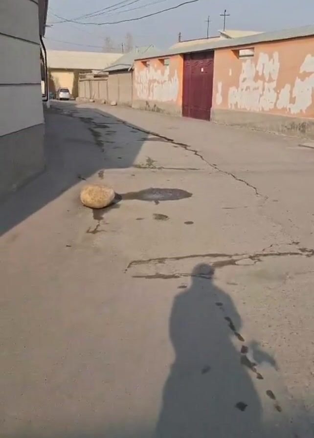 narrow, cracked asphalt street in a residential area. Buildings with light-colored walls line both sides of the street. A maroon-colored garage door is visible on the right side. There are power lines overhead. A round object, possibly a stone or a large piece of bread, sits on the left side of the street near the camera. The shadow of the person holding the camera is visible on the ground. At the end of the street, a white car is parked. The sky is light blue and clear.
