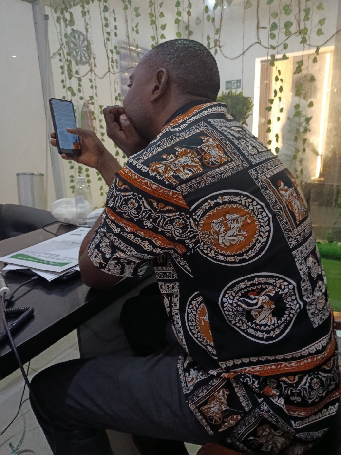 An adult male, viewed from the right side and slightly from the rear, is seated at a dark desk in an indoor environment in Gwarinpa, Nigeria