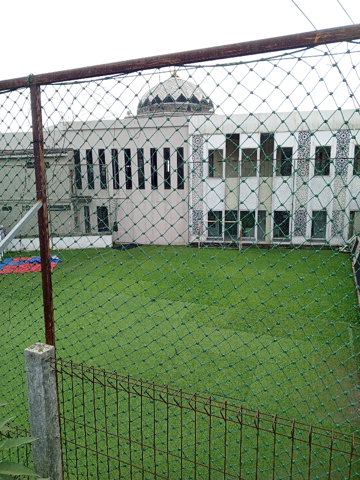 A two-story building with a decorative dome is visible through a double fence. The building has distinct sections: one side with narrow, rectangular windows, the other with a lighter facade and larger openings framed by patterned designs. A vibrant green lawn stretches between the building and the fences. Some colored material is visible near the building. The foreground shows the two-layer fence.