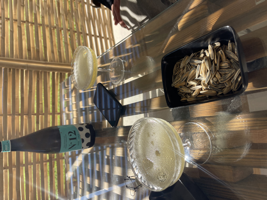 The image depicts an outdoor scene in Vilar, Spain, focused on a glass-top table set with beverages and snacks under direct sunlight. A dark bottle of "PACO & LOLA N° 12 BARNIZ BRUT" sparkling wine stands near the top-center. To its right, a black smartphone with a dark screen lies on the table. Two coupe glasses, filled with a pale yellow, effervescent liquid, are present; one is in the foreground to the left, and another is further back to the right. A small, black rectangular bowl containing striped sunflower seeds is positioned on the table to the right of the foreground glass. A metallic champagne cork cage (muselet) rests on the table surface to the left of the foreground glass. Strong parallel shadows, cast by a slatted wooden or bamboo screen in the background, fall across the table. A person's arm and torso, clad in light-colored clothing, are partially visible on the right side of the frame, behind the rightmost glass. Green foliage is faintly visible beyond the background screen.