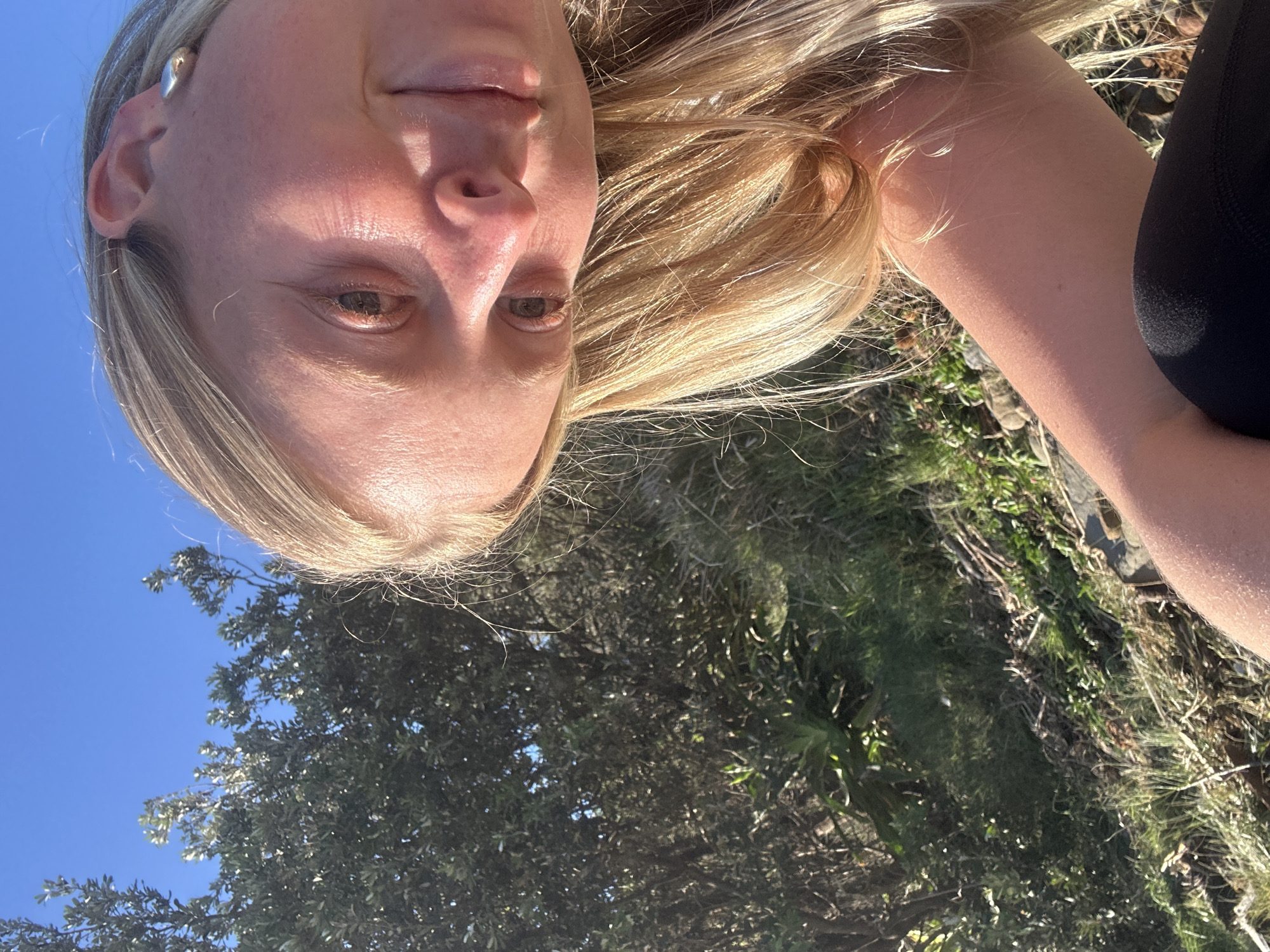 A selfie taken outdoors with a blue sky in the background. A blonde woman is the main subject of the image. She is wearing black clothing. The location is likely a park or natural area in Bulli, Australia, based on the presence of trees and vegetation.