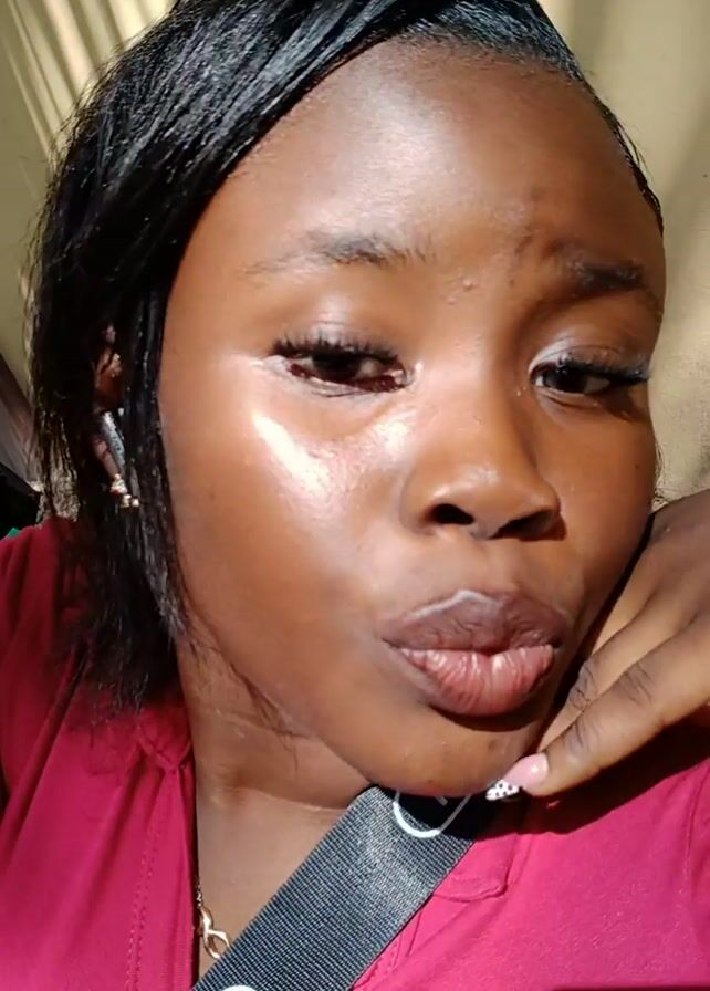 A young woman with dark skin and long black hair is resting her head on her hand, looking up toward the camera. She is wearing a reddish-pink shirt and a black shoulder strap with white lettering. She has long, manicured fingernails and is wearing earrings. The background is a light yellow wall with shadows from sunlight. There is indistinct background noise of voices speaking.