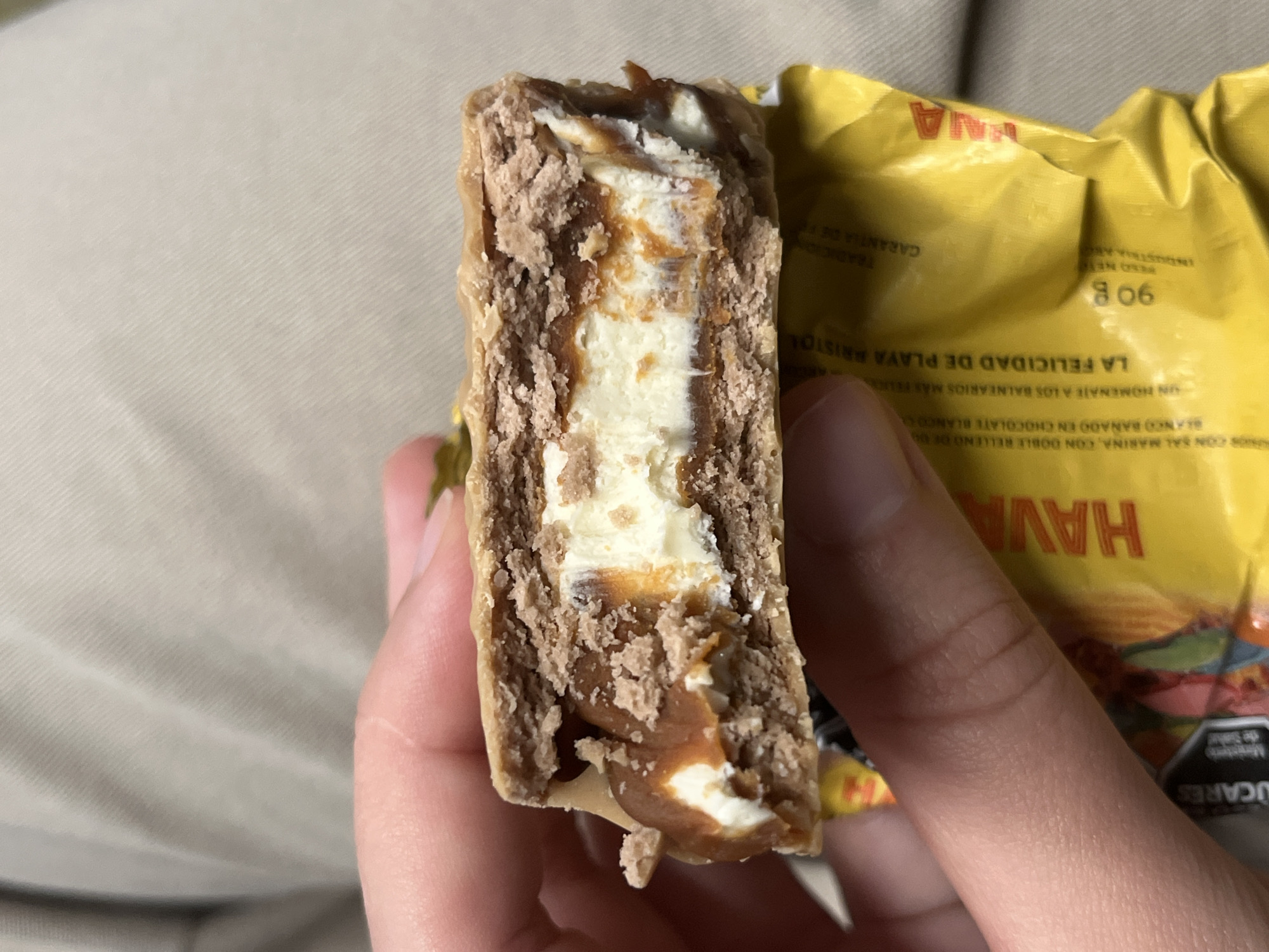 A close-up shot depicts a partially eaten Havanna Alfajor Playa Bristol candy bar held in a hand