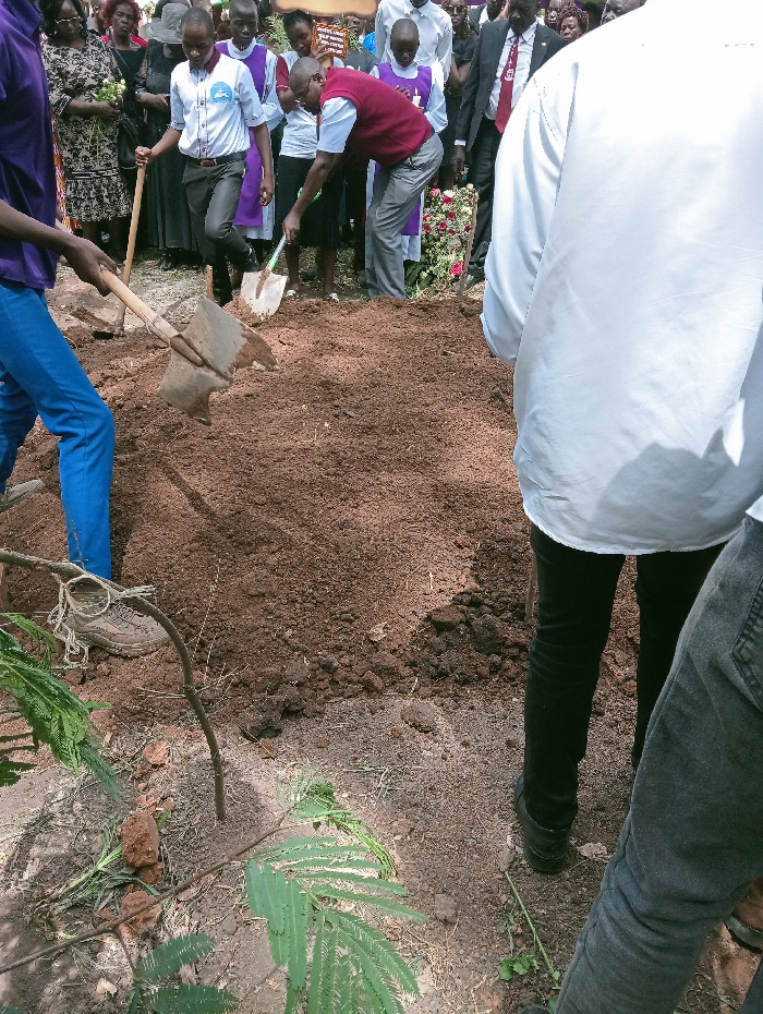 This image depicts a burial ceremony in Lumakanda ward, Kenya, focused on the active process of filling a grave