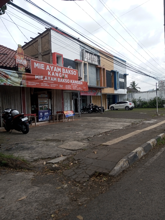 The image depicts a street scene in Khajuripada, India, featuring a row of commercial buildings on an overcast day. In the foreground, a damaged asphalt road with a black and white striped curb transitions into a cracked concrete sidewalk with exposed roots and debris. A yellow tactile paving strip is visible on the sidewalk. To the left, the primary subject is a restaurant named "MIE AYAM BAKSO KANGEN," identified by large red banners displaying its name and a menu listing items in Indonesian, such as "Mie Ayam Bakso," "Mie Rebus," and "Nasi Goreng." A large, bottle-shaped sign for "Pucuk Harum" is affixed to the building's facade. Two small, red-topped tables with associated stools are positioned on the paved area in front of the restaurant. Two dark-colored motorcycles are parked on this patio directly in front of the restaurant. Adjacent to the "MIE AYAM BAKSO KANGEN" restaurant, a series of multi-story buildings extend to the right, exhibiting varied facades in white, red, grey, yellow, brown, and blue tones. Several more motorcycles are parked closer to these buildings. To the right of the buildings, a white SUV is parked in a gravel/dirt lot. This unpaved area is bordered by a white wall and sparse vegetation, including a visible palm tree in the background. Overhead, numerous black utility wires crisscross the sky. No people are visible in the scene.