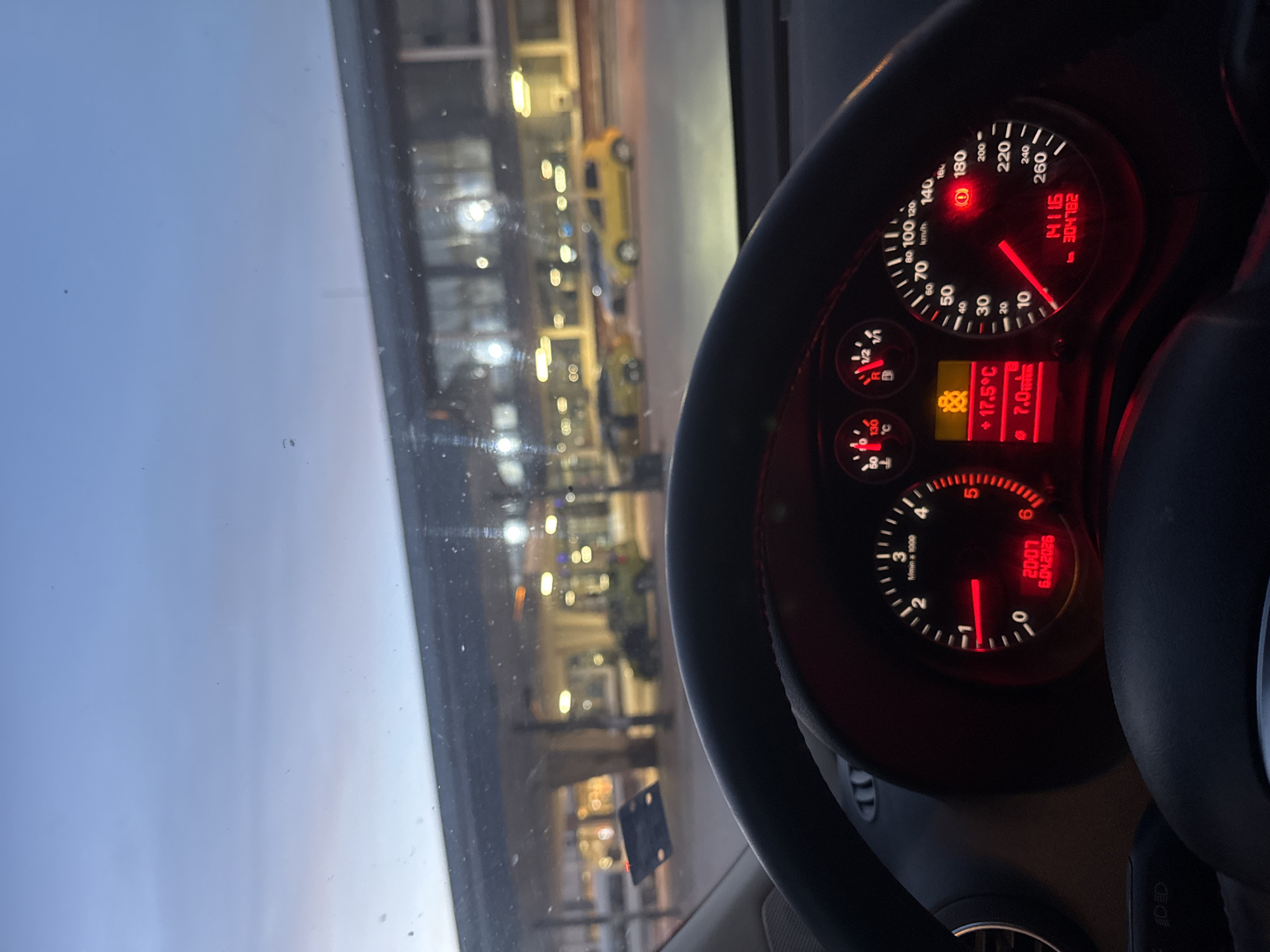 The image captures a view from inside a car, focusing on the dashboard. The speedometer indicates the car is stationary, with the needle pointing to 0 km/h. The odometer reads "304782". Other indicators display the temperature as 17.5 degrees Celsius and fuel consumption as 7.0l/100km. The date on the display is 6.04.2026 and time is 20:07. Outside the car, through the windshield, is a street scene, likely in an urban area. Yellow and green vehicles are parked along the street, and buildings with numerous lights are visible. The sky suggests it is dusk or early evening. The location is in the city of Unknown, Unknown.