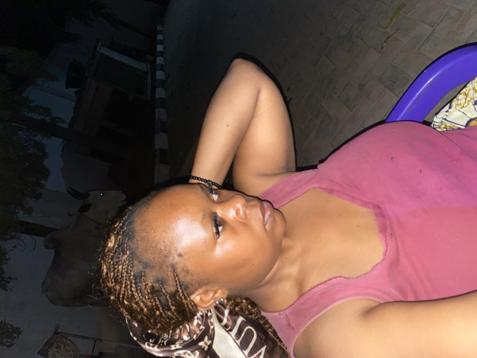 A woman with braided hair and a mauve top reclines in a chair. A Louis Vuitton patterned item rests beneath her head. She wears a black bracelet on her left wrist. In the background, a shadowy figure resembling a cow stands near a building. The lighting is low, casting long shadows. A blue chair partially visible on the upper right.