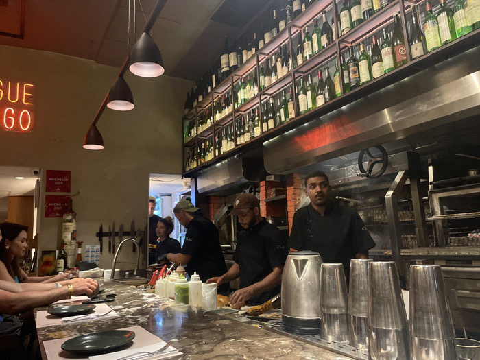 A busy restaurant scene with diners at a marble counter, plates and silverware set. Four chefs are visible, one preparing food at the counter. Behind them, a grill and oven area with brick accents. Above, shelves lined with numerous wine bottles stretch across the wall. A modern light fixture hangs overhead. A neon sign and Michelin star awards are displayed on the left.