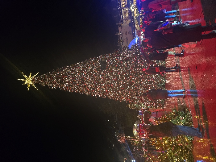 A nighttime image depicts the Place du Casino in Monte Carlo, Monaco, adorned for the Christmas season