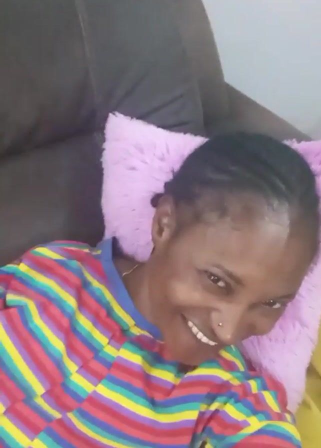 A woman is lying on a couch, supported by a pink pillow and a yellow pillow. She is wearing a colorful striped shirt. She smiles and looks into the camera. In the background, someone's arm is visible. They are holding a white object. The couch is dark brown. The wall is light grey.