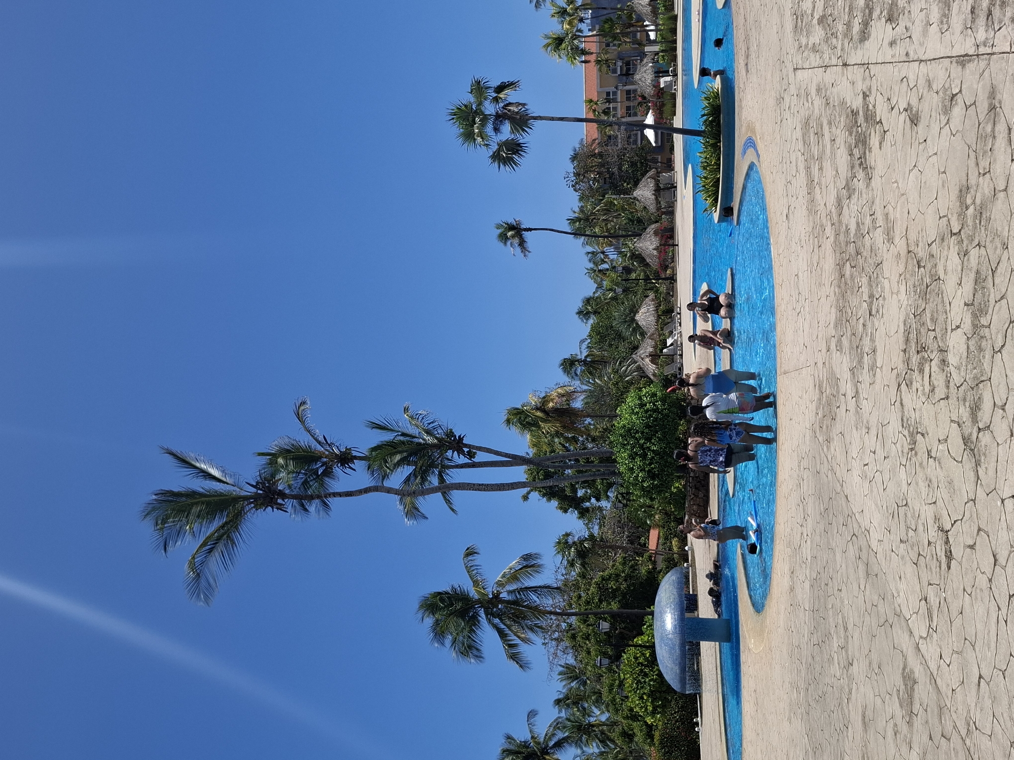 n outdoor swimming pool with several people in it. The pool is surrounded by a light-colored, stone-patterned deck. Palm trees line the edge of the pool area. In the background, there are buildings, including a multistory hotel. The sky is clear and blue. The location is Playa El Agua, Venezuela.